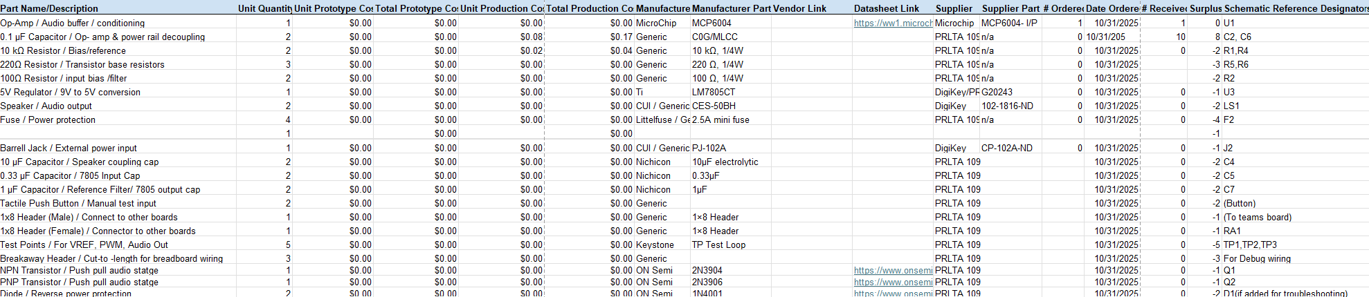 The BOM shows every part thats required to build and my speaker subsystem. It includes transistors, resistors, capacitors, voltage regulator, connectors, op amp, and the speaker. I put all the parts from my schematic into the BOM noting which items are from PRLTA and the hardware that would be ordered from a external source.