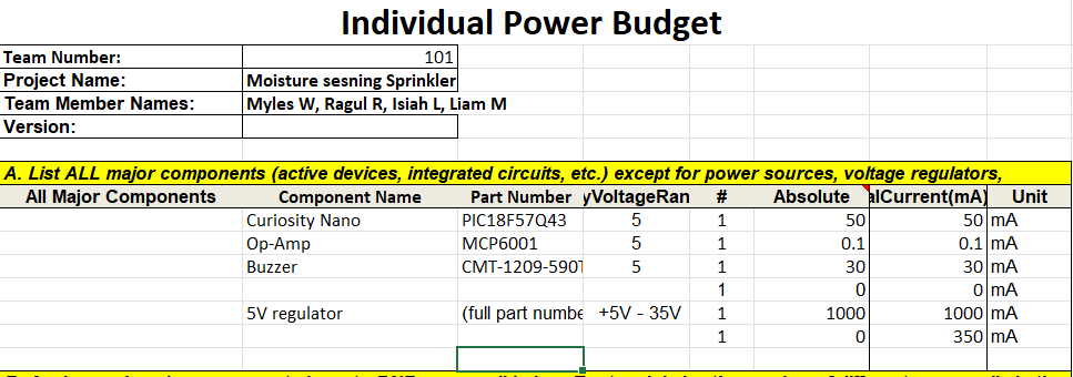 Created this Power Budget to anaylze and verify the power requirements of my speaker subsystem within the Sprinkler project. The goal was to ensure that all components I am ising operate safely and effcieently from a shared 5V rail. By getting the calculated current draw and adding a 25% saftey margin and confirming the compatibility with the external power supply with the voltage regulator, and it will demonstrate that the system can provide suffecient current to all active components without overrloading the supply.